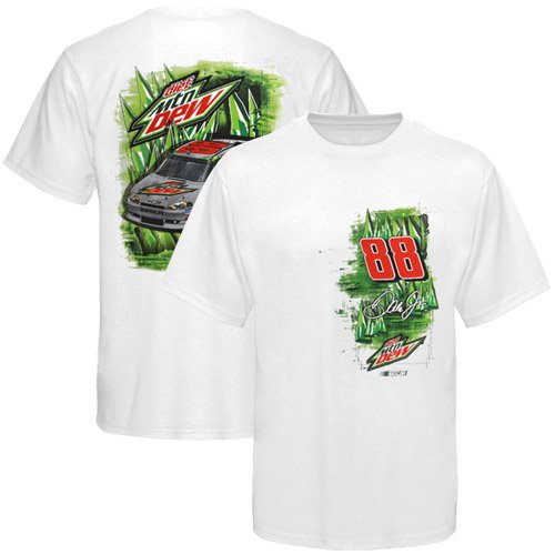 Aiming for yet another victory, NASCAR's most popular driver, Dale Earnhardt Jr., will be driving a new vehicle sponsored by Diet Mountain Dew for the 2012 Daytona 500 race. To celebrate this event and support Junior all the way, you can don this Announcement tee from Chase Authentics and show the world the first glimpse of the car that will surely be the first to finish the Great American race. With the driver's number, his signature and the sponsor logo layered over Mountain Dew-inspired graphics on the left chest and a metal-accented print of the new vehicle along with more MD graphics on the back, this comfy tee will have you supporting Dale Jr. all the way to the finish line!