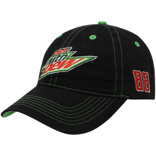 As your boy Junior prepares to drive a new vehicle sponsored by Diet Mountain Dew for the 2012 Daytona 500 race, you can celebrate this historic event with this stylish adjustable hat from Chase Authentics. Featuring a bold sponsor logo embroidered on the crown, "Fueled by Diet Dew" lettering arched across the back, Junior's name embroidered on the head strap and his number on the left side, along with contrast Mountain Dew-colored underbill, top button, eyelets and allover stitching, this cap will have you supporting Dale Jr. all the way to the finish line!